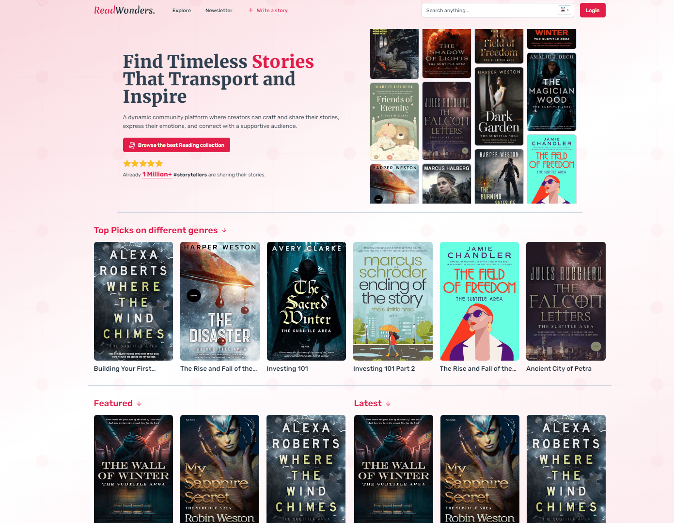 Readora is a storytelling platform where users can read, write, and share stories across various genres. Best alternative to wattpad, webnovels, royalroads and other platforms.
